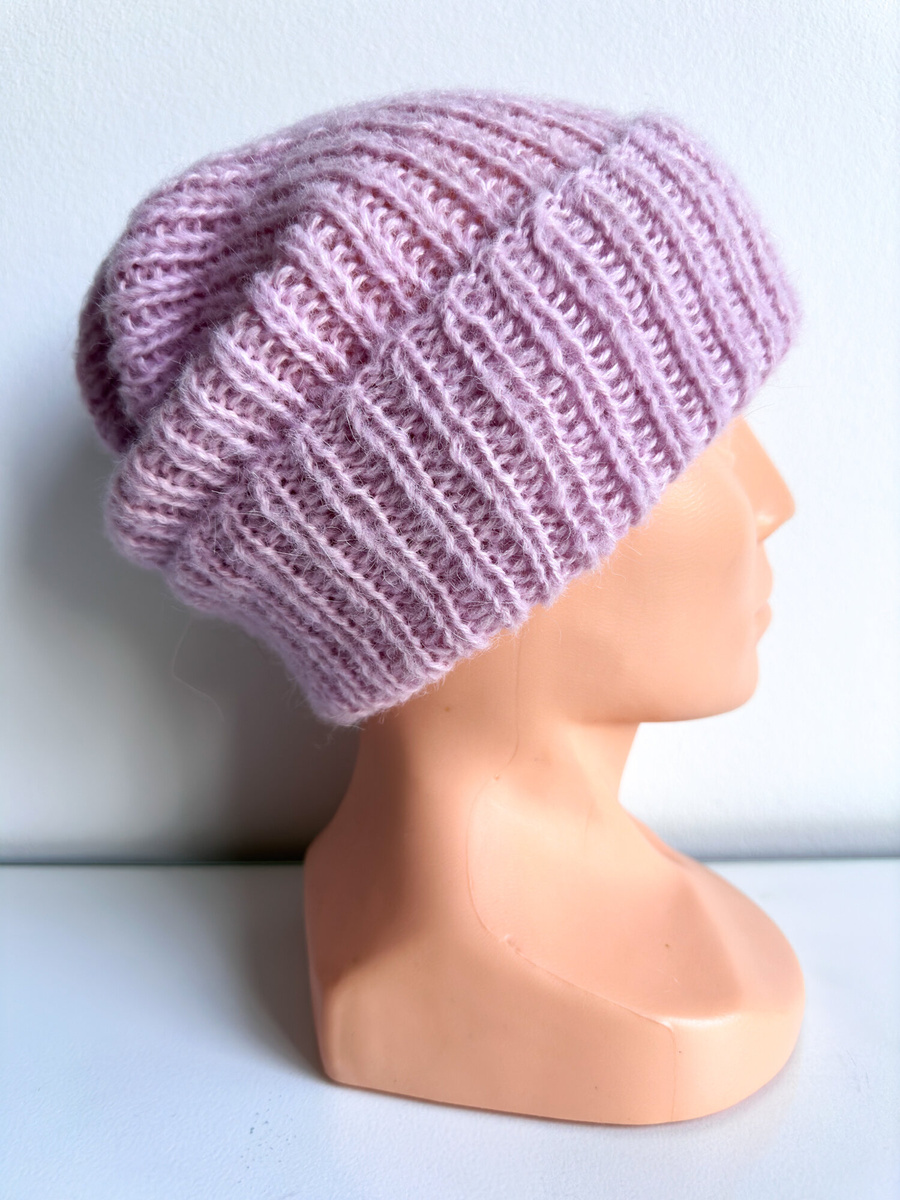 Ręcznie robiona, wywijana czapka beanie z alpaki z dodatkiem jedwabiu w odcieniu różu, o średniej grubości, przeznaczona na jesień i zimę, z wyraźnie puszystą, miękką fakturą. Dostępność konkretnego egzemplarza (od ręki lub na zamówienie) sprawdzisz po wybraniu rozmiaru na karcie produktu.