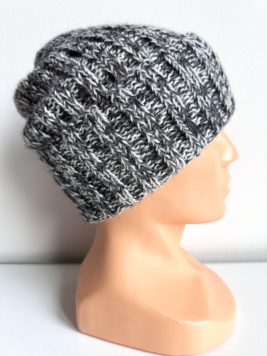 Wywijana czapka beanie LAURIN z 100% wełny alpaki w ciemnoszarym melanżu to średniej grubości model jesienno-zimowy, wykonany ręcznie na drutach podwójnym ściągaczem. Dostępność konkretnego rozmiaru sprawdzisz po jego kliknięciu – część wariantów jest wysyłana od ręki, inne wykonuję na zamówienie.